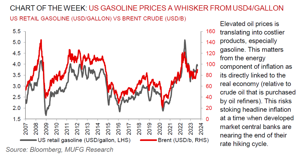 After the longest winning run in more than four years following announced extension in production cuts from Saudi Arabia and Russia, the front-end of the crude is taking a breather with oil steadying ~USD90/b (see here). Brent’s 14 day relative strength index (RSI) has been thrusted well into overbought territory (above 70) and a moderate pause in the rally reinforces our conviction of Brent remaining in the USD80s/b handle for the remainder of this year (see here). Meanwhile, European natural gas (TTF) prices have fallen over 12% this week with delayed strike action at Australian LNG facilities raising hopes that parties could come to a deal.