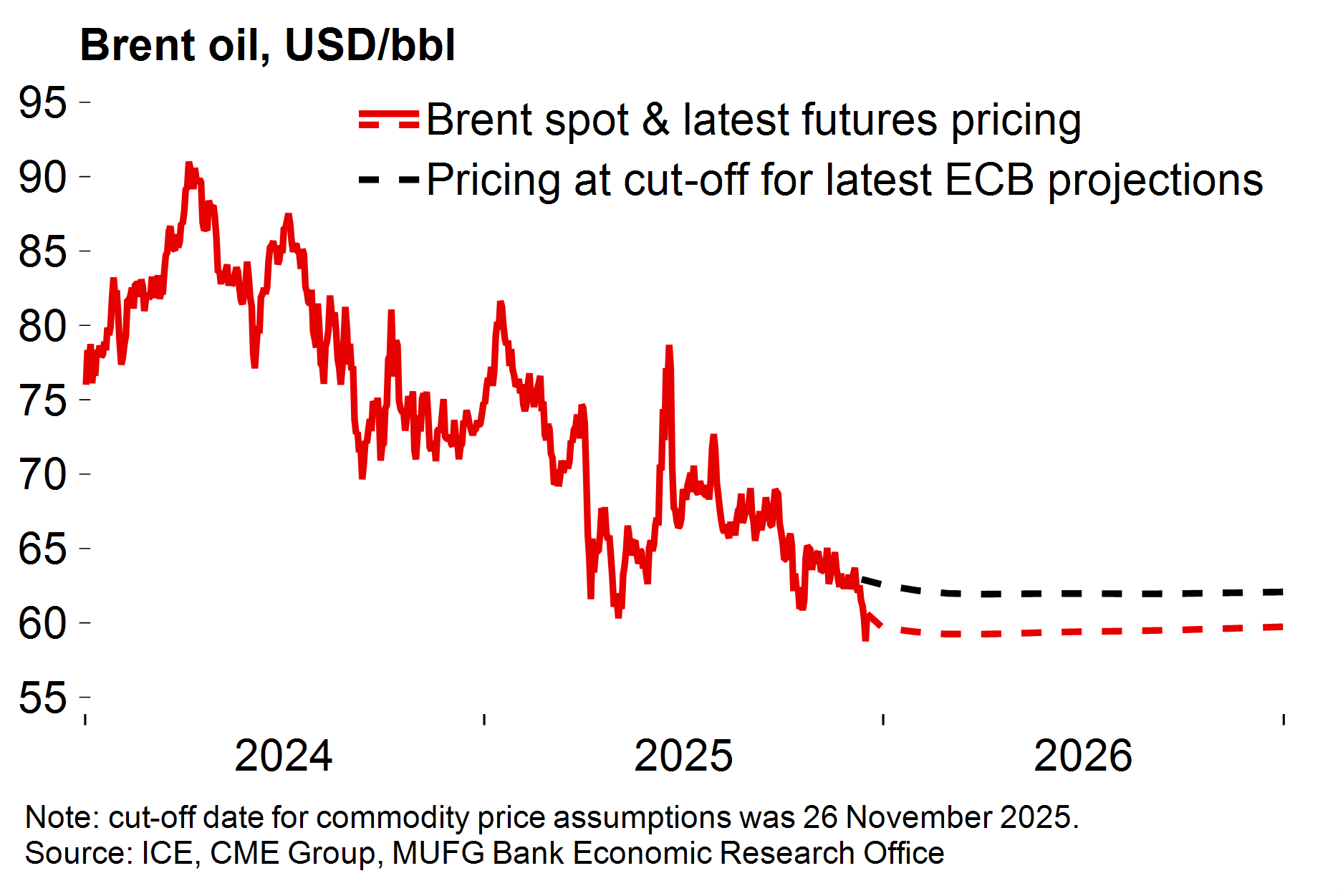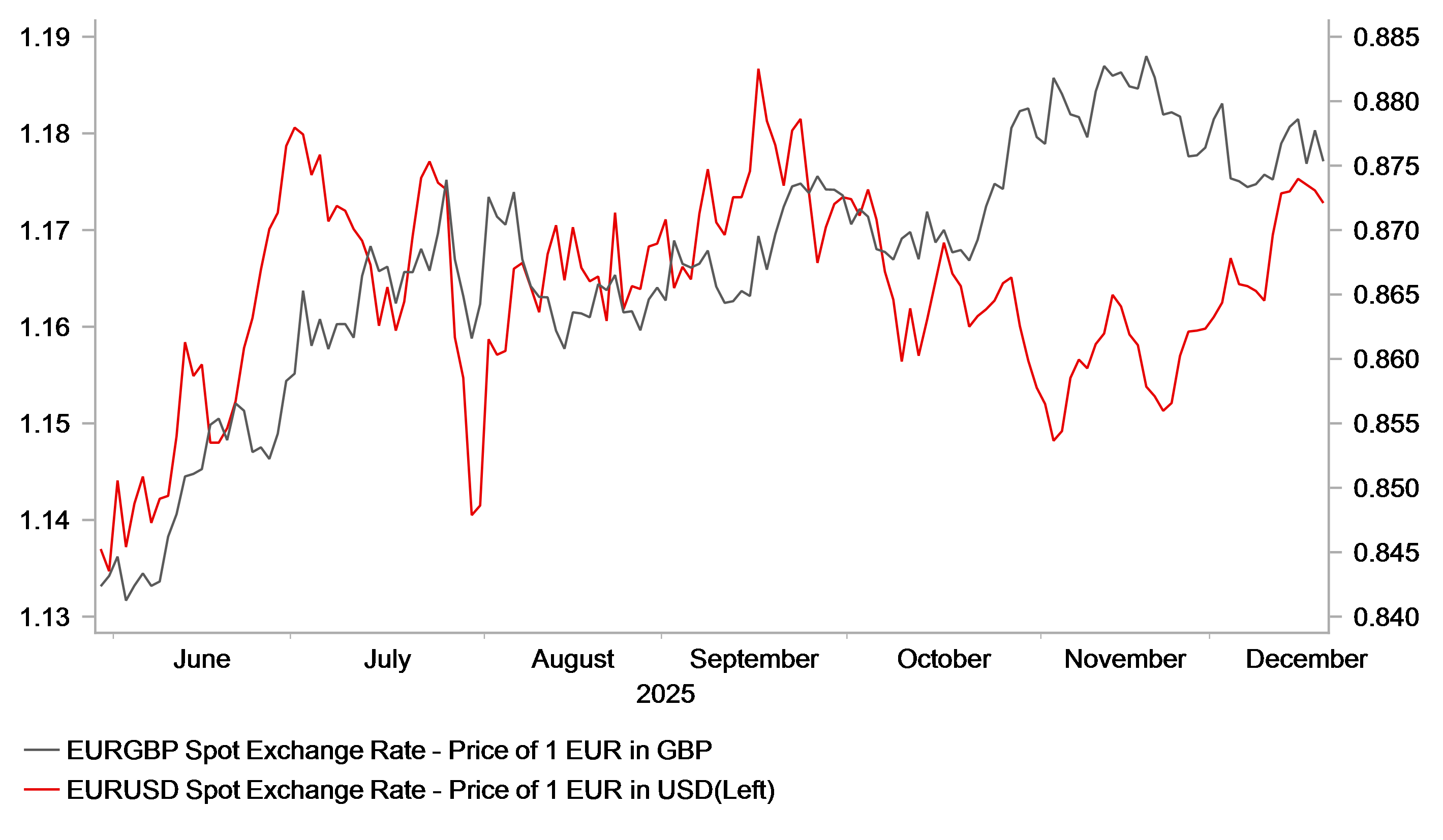 - We have removed our forecast for one final 25 bps ECB rate cut in 2026. However, it remains premature for the euro-zone rates market to price in hikes as early as next year, given that inflation is still expected to undershoot the ECB’s target. Euro-zone rates have already moved higher recently as markets priced out further ECB cuts, providing additional support for the euro. With the BoE and the Fed still expected to lower rates further next year, we forecast continued EUR strength in 2026 while the ECB keeps its policy rate on hold.