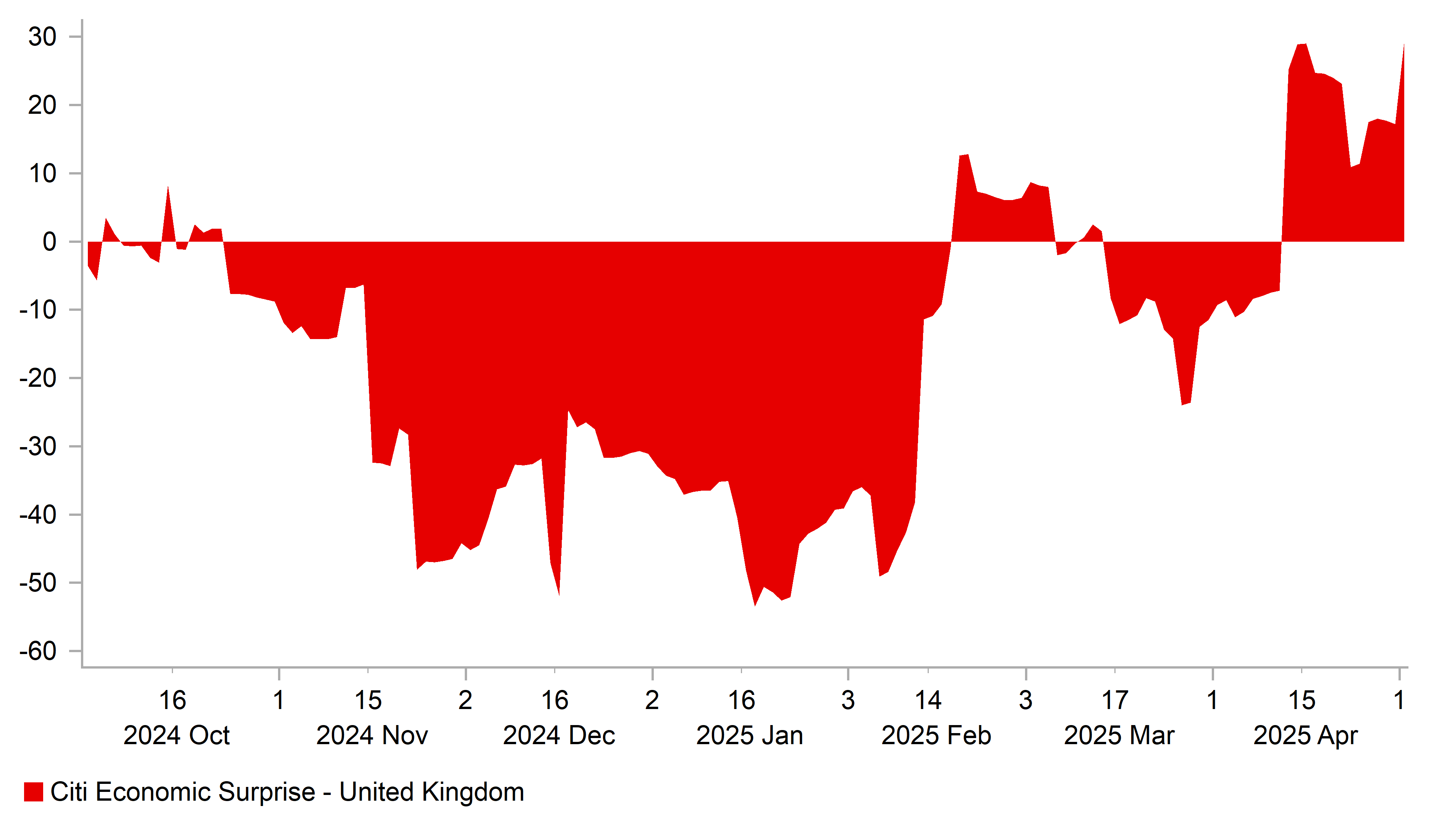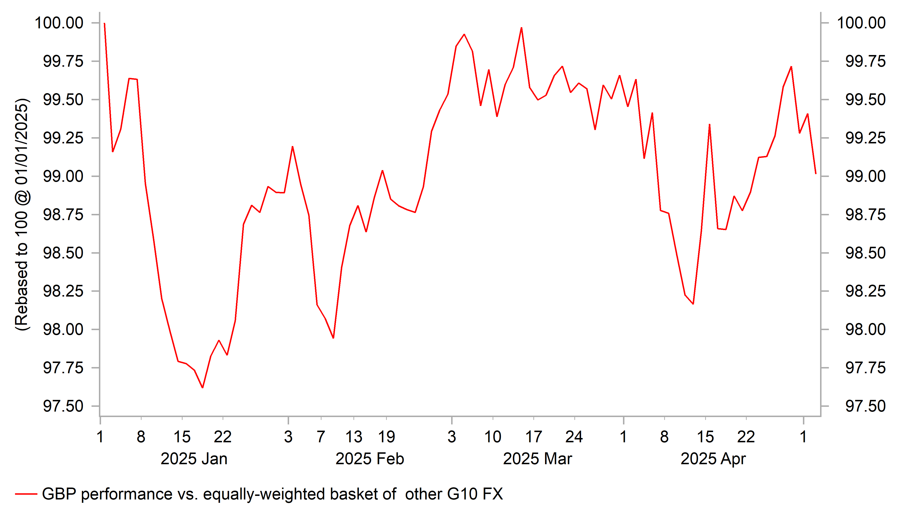 The GBP has been hit harder recently by the sharp jump in financial market volatility triggered by the initial fallout from President Trump’s tariff plans. It has triggered an unwind of carry trades that reinforced the sell-off in higher yielding currencies such as the GBP. At the same time, unfavourable external conditions have made it more challenging for countries that rely more on external financing such as the UK whose current account deficit totalled just under 3% of GDP last year. Negative sentiment towards the GBP was reinforced as well last month by the renewed sell-off in the Gilt market which was hit by negative spill-overs from the sell-off in the US Treasury market. The 30-year Gilt yield temporarily jumped by around 60bps between 7th and 9th April which was similar in size to the move higher in the 30-year US Treasury yield. After peaking at 5.66% on 9th April, the 30-year Gilt yield has since dropped back towards 5.20% alongside an easing of financial market volatility helping the GBP to rebound.
