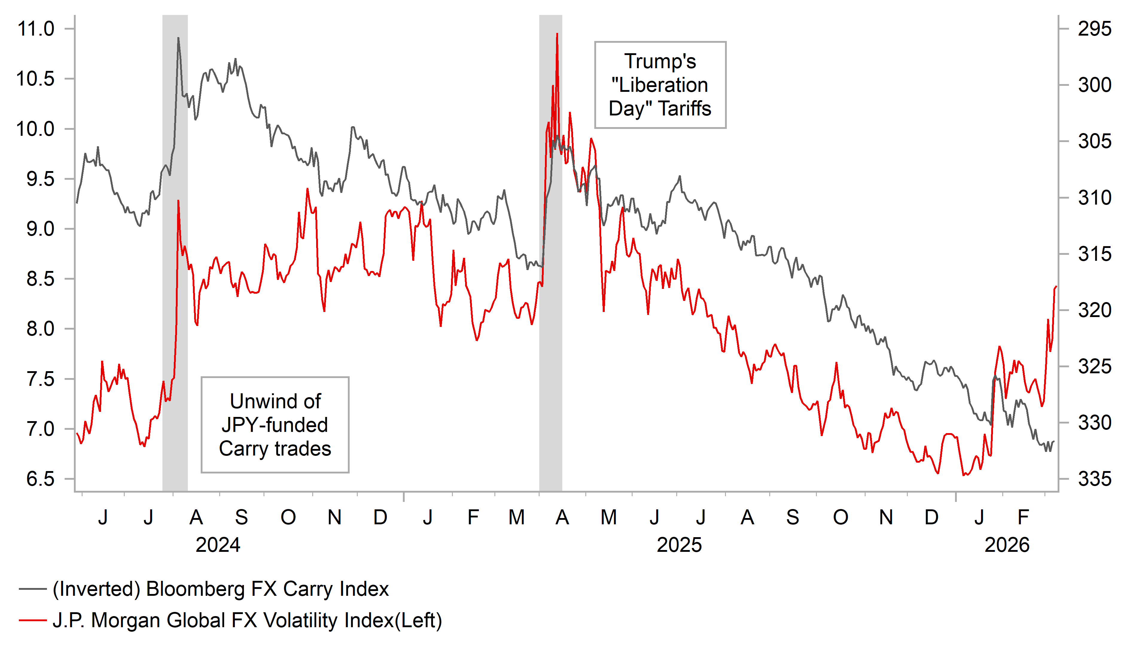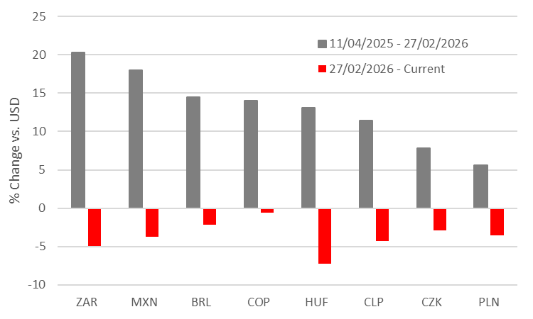 The volatility shock stemming from the conflict in the Middle East is creating a more challenging backdrop for FX carry trades and could yet trigger a larger liquidation of popular carry trade positions. Bloomberg’s measure of FX carry trade performance had been performing strongly since April of last year. President Trump’s “Liberation Day” tariff announcement that month marked the peak in financial‑market volatility, and the subsequent decline in volatility encouraged investors to build up carry trade exposures. Looking at FX performance since volatility peaked on 11th April last year, the best‑performing emerging‑market currencies prior to the outbreak of conflict in the Middle East were the ZAR, MXN, BRL, COP, HUF, CLP, CZK, and PLN. These currencies have begun to correct over the past week since the conflict began. The high‑yielding European currencies of the HUF and PLN along with the CLP have experienced the sharpest declines relative to their earlier gains. For the HUF and PLN especially, the sell‑off has been reinforced by concerns that European economies will be hit harder by the negative terms‑of‑trade shock associated with higher energy prices.