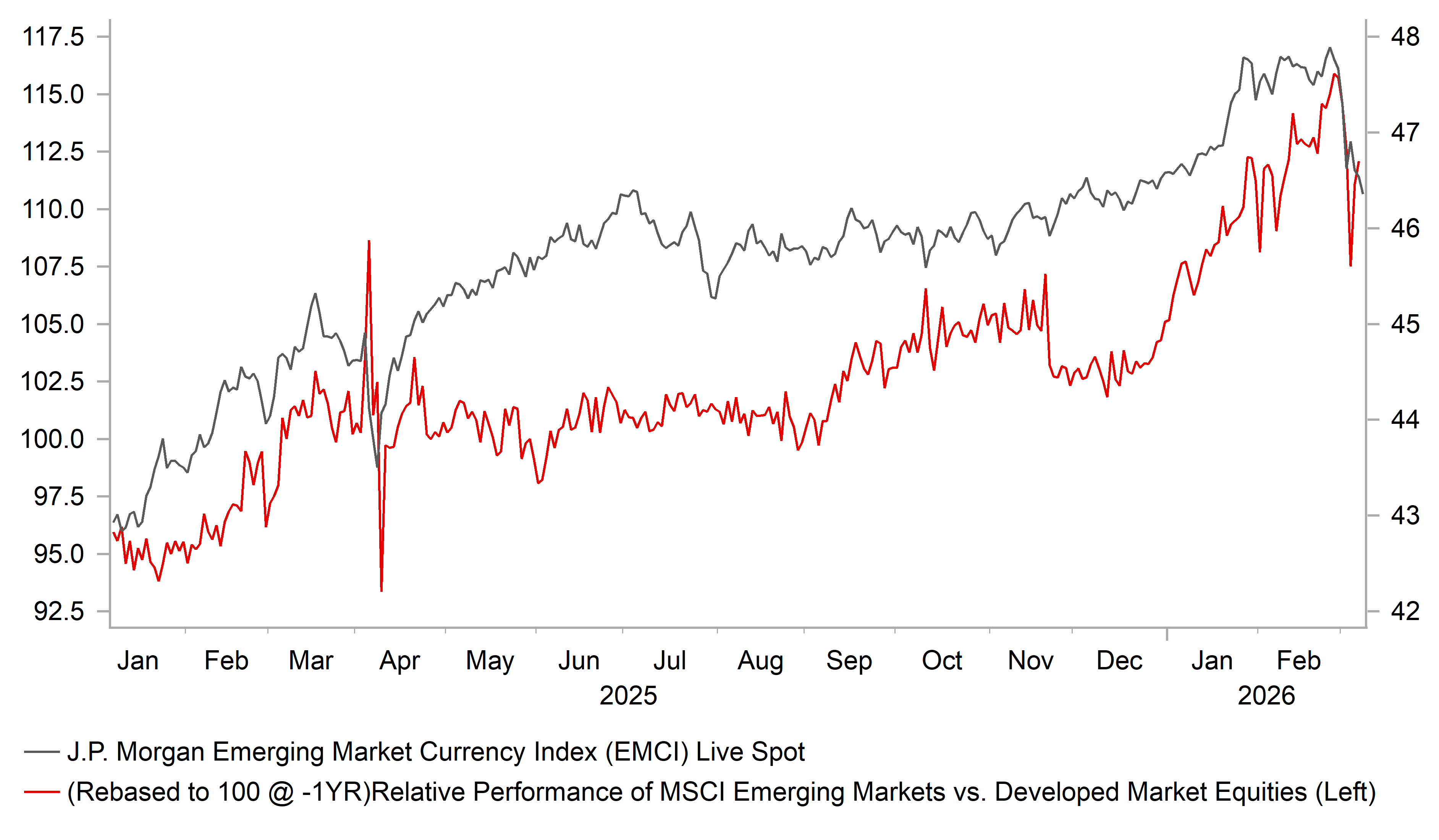 On the other hand, funding currencies such as the JPY have not rebounded. The BoJ’s trade‑weighted JPY index remains close to year‑to‑date lows. The JPY strengthened on the last two occasions when FX volatility spiked, first in April 2025 and again in the summer of 2024. This price action highlights the risk that the JPY could stage a counter trend rally if the volatility shock from the conflict in the Middle East intensifies triggered by a squeeze of JPY‑funded carry positions that have been built up since the Ukraine conflict began in 2022. During the last major energy price shock in 2022, the JPY was one of the worst‑performing G10 currencies (alongside the SEK), as Japan was hit by a sharp negative terms‑of‑trade shock and the BoJ maintained a cautious stance, keeping rates on hold while the Fed and other major central banks lifted rates away from the zero bound. This policy divergence encouraged the build-up of JPY‑funded carry trades. The trade‑weighted JPY has weakened significantly since that 2022 energy shock by around 23%, with over half of those losses occurring after market volatility peaked in April 2025 when Trump announced his Liberation Day tariffs.