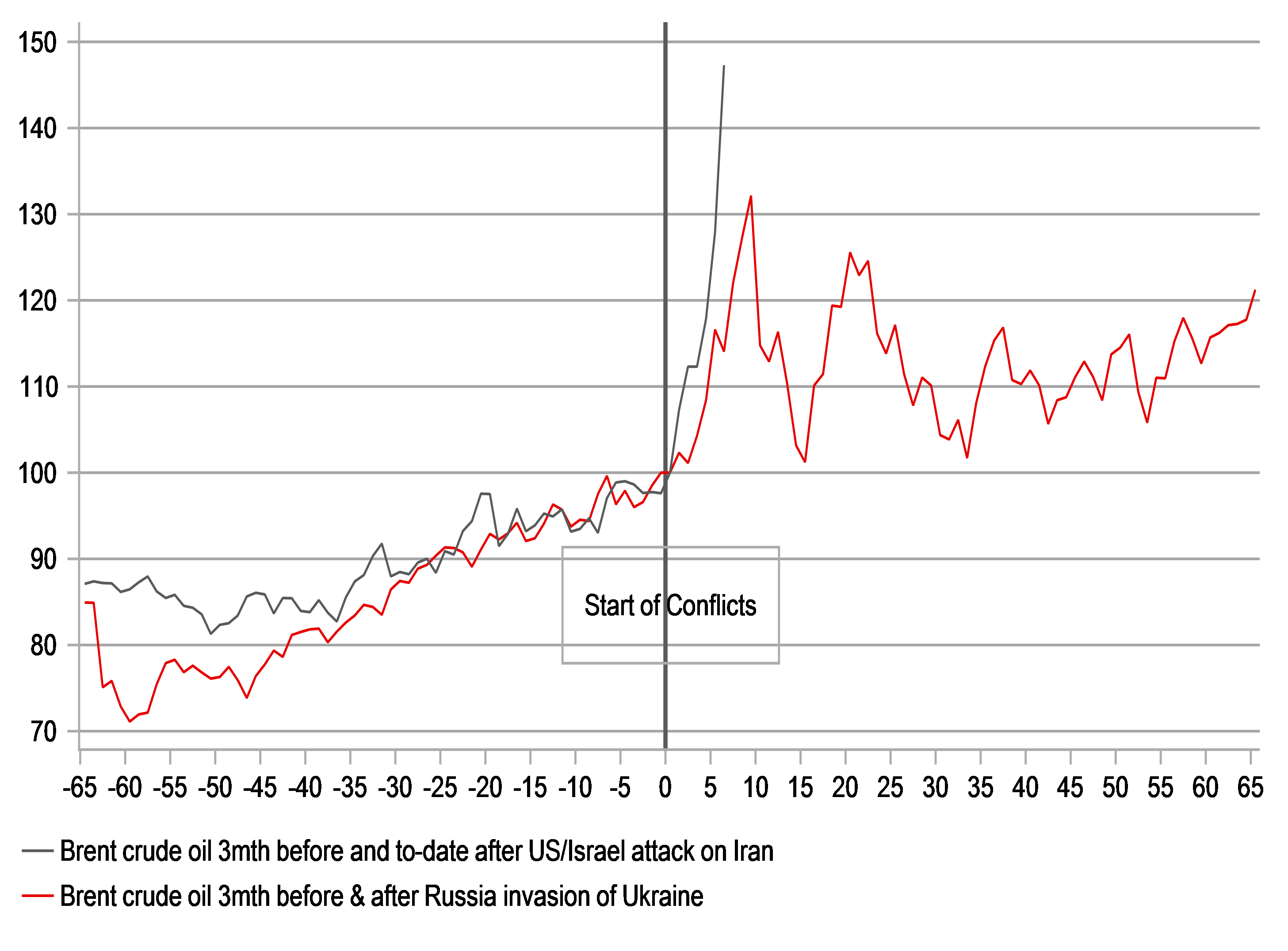 We are in the very early stages of the US-Iran conflict and the financial market moves have been relatively contained outside of energy, perhaps reflecting the scale of unknowns and uncertainties in regard to the scale of this conflict. Investors may not want to yet price a bad scenario given the unpredictability of President Trump and his capacity to suddenly change tack, by perhaps seeking an off-ramp to de-escalate more quickly than expected. One similarity between this conflict and the Russia invasion of Ukraine is that investors were not completely taken by surprise. There had been a build-up of Russian troops for months ahead of the invasion just like now there has been a steady build-up of US military in the Middle East. Hence, investors had been pricing the risk of a conflict well before the start and the crude oil chart below indicates a similar performance for crude oil in the months leading up to the start of the conflicts and the very early initial reactions. As it became clearer that Russian crude supplies would be sanctioned and that Russia would use natural gas as a weapon energy prices then surged. The deterioration in supply expectations over the weekend has now seen the crude oil price surge surpass the 2022 episode and this along with the surge in short-term rates in Europe means this will quickly translate to a growth shock.
