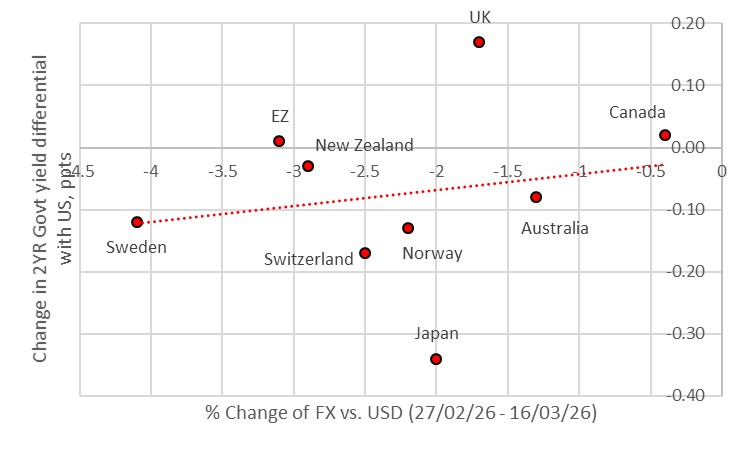 This week’s heavy calendar of G10 central bank meetings will provide further clarity on how policymakers intend to respond to the inflationary shock stemming from the ongoing conflict in the Middle East. Two‑year government bond yields, often used as a gauge of central bank expectations, show a striking divergence in market repricing across countries. The sharpest hawkish adjustment has occurred in the UK, where yields have risen by roughly 57 basis points. At the opposite end of the spectrum, Japan has seen the smallest adjustment, with yields increasing by only around 6 basis points indicating that market participants expect the BoJ to remain cautious over delivering further rate hikes while Japan’s economy will be hit harder by the negative energy price shock.