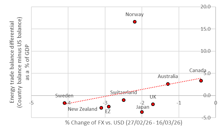 - The main focus in the week ahead will remain on geopolitical developments in the Middle East, which are likely to continue driving foreign exchange market performance. A quicker end to the conflict would help ease concerns about supply disruptions, while further retaliatory strikes by Iran on energy infrastructure would significantly heighten those risks.