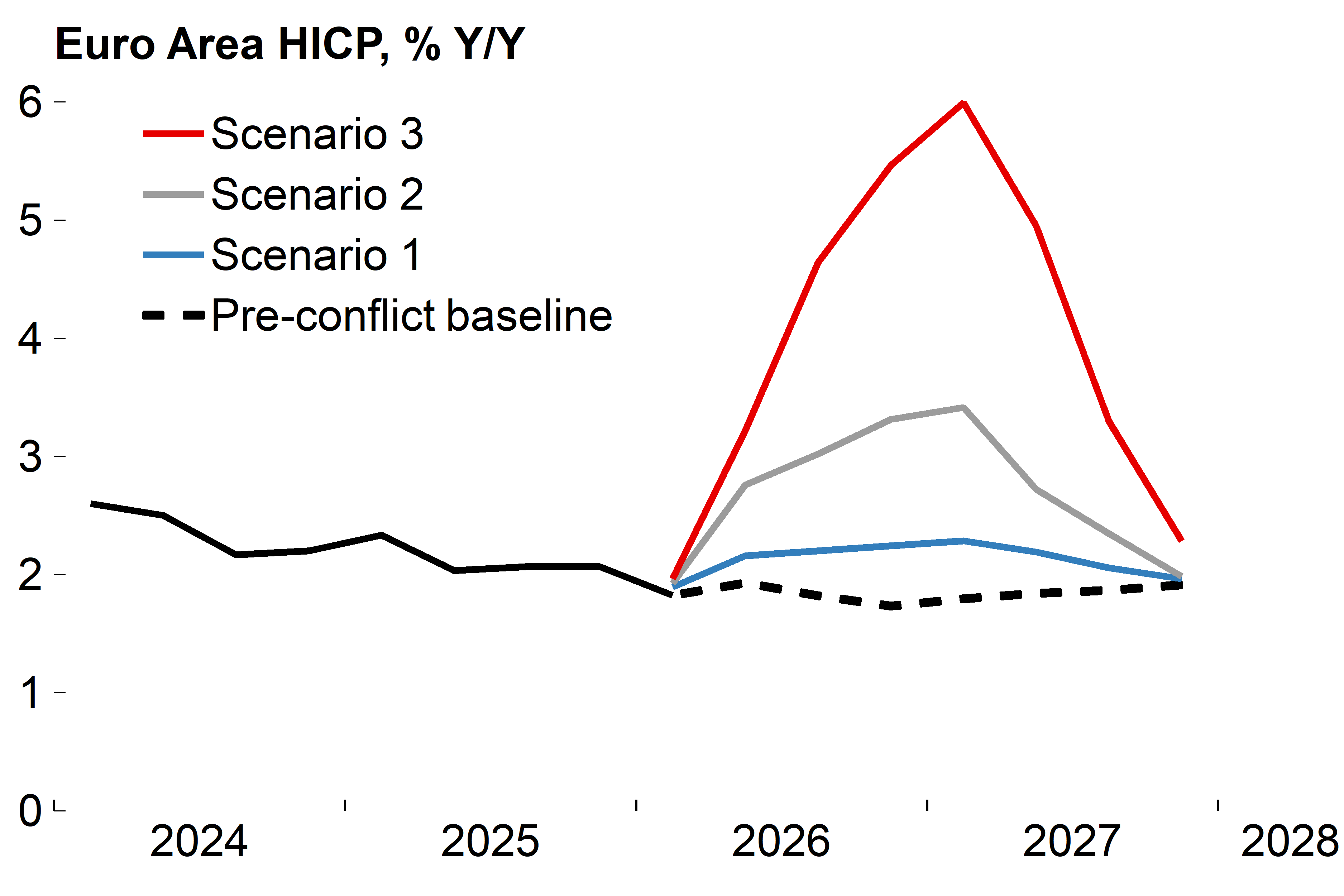 The length the conflict will be closely tied to the potential severity and hence timelines are important in laying out these scenarios. Scenario 1 is the best case scenario that perhaps investors continue to hold out hope for. This would essentially see de-escalation materialise relatively quickly certainly now with the conflict over two weeks old, de-escalation is over the next week, to ten days, to two weeks max. There is a compelling logic to this still potentially happening with President Trump likely to face increasing pressure domestically if energy prices continue to rise and if the US suffers further loss of lives. With the mid-term elections in November, a renewed rise in gasoline prices and grocery prices that stick for longer would be hugely damaging to the prospects for the Republicans in November. According to the US Central Command (CENTCOM) the US has struck 6,000 Iranian targets since the war began. With the supreme leader and many family members killed and the new supreme leader reportedly badly injured, President Trump could at some stage soon claim victory and move to de-escalate. In Scenario 1 we would see Brent crude oil in a range of USD 75-85 p/bl, which assume a risk premium of USD 10 p/bl is in the price for some time. The US dollar could weaken back modestly with EUR/USD in a 1.16-1.18 range.