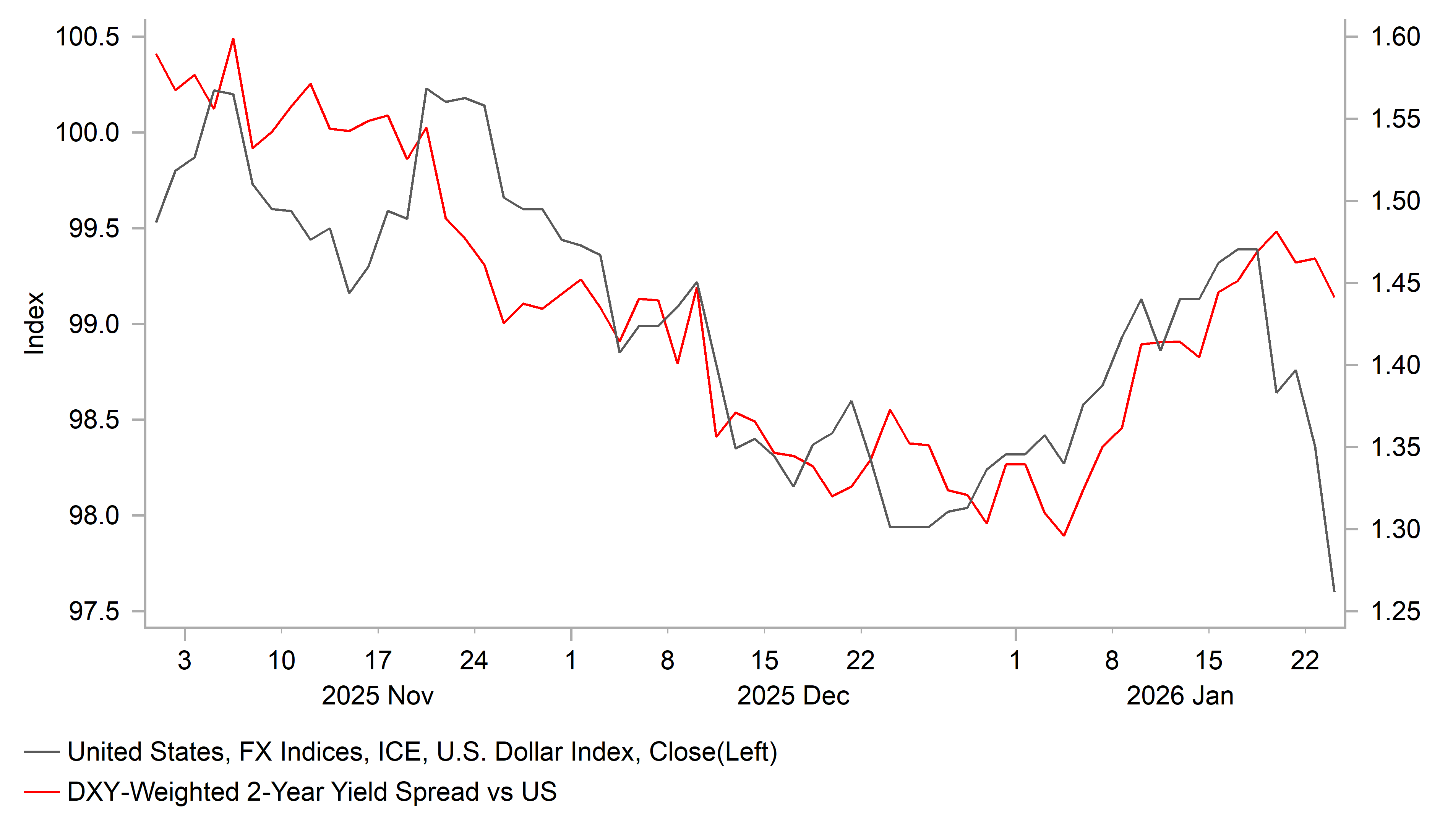 The recent divergence between USD performance and yield spreads has been driven by a renewed increase in U.S. policy uncertainty, which has weighed on the USD much as it did last year. President Trump’s threats toward fellow NATO allies over Greenland, while short‑lived, may nonetheless have a more lasting negative impact on investor confidence and could further encourage foreign investors to increase FX hedging on U.S. asset holdings. This comes at a time when President Trump has launched a fresh attack on the Federal Reserve’s independence, threatening Chair Powell with a potential criminal indictment related to his testimony to Congress on cost overruns associated with a Federal Reserve headquarters renovation project. While we do not expect these attacks to force the Fed to cut rates, they are likely contributing to a gradual erosion of investor confidence in U.S. policymaking, which remains a headwind for USD performance. Second, the weaker USD may also reflect growing investor optimism around the outlook for stronger global growth this year. The outperformance of commodity‑linked G10 currencies such as the AUD, alongside gains in Latam FX at the start of the year, has been supported by improving global growth expectations and rising commodity prices. The SEK also stands to benefit, given Sweden’s status as a small and open economy. President Trump’s rapid policy U‑turn in dropping the threat of higher tariffs on fellow NATO members, including France, Germany, and the UK, has helped ease downside risks to global growth by reducing the likelihood of another tit‑for‑tat trade war between the U.S. and the EU.