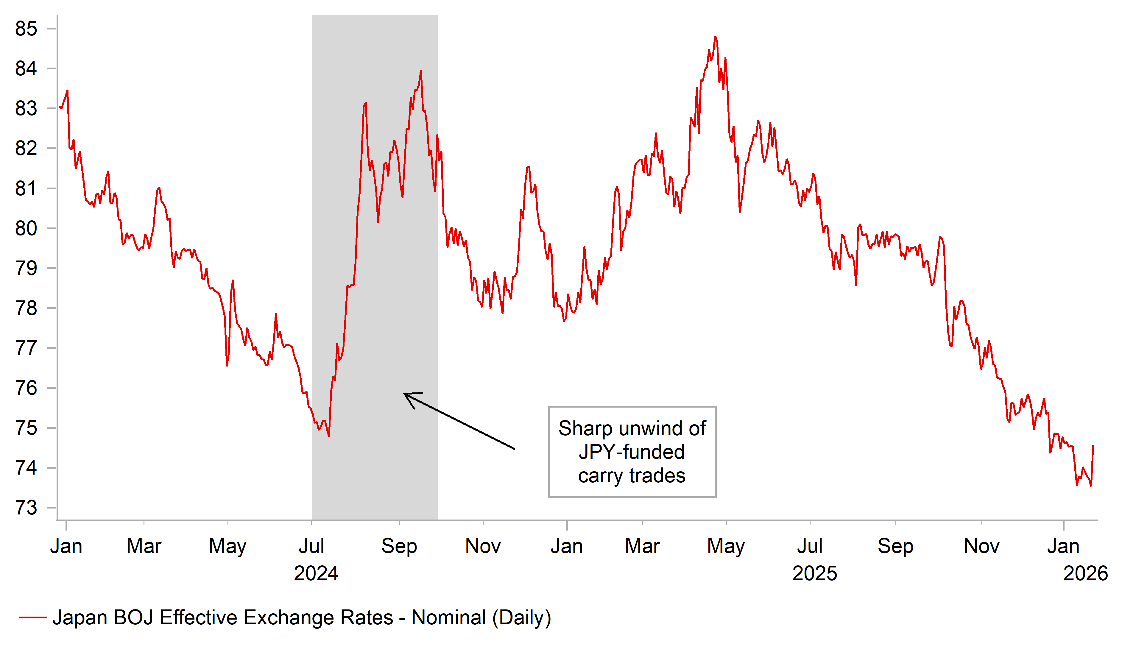 If the JPY continues to strengthen, market participants are likely to become increasingly wary of the risk of a more disruptive unwind of JPY‑funded carry trades, similar to what was seen between July and August 2024. On that occasion, the S&P 500 equity index fell by almost 10% as risk assets were hit hard by the rapid carry unwind. Such a development would threaten the recent outperformance of high‑beta carry currencies, including the AUD among G10 currencies, as well as emerging market currencies that have benefited from a weaker USD, rising commodity prices, and a backdrop of low financial market volatility.