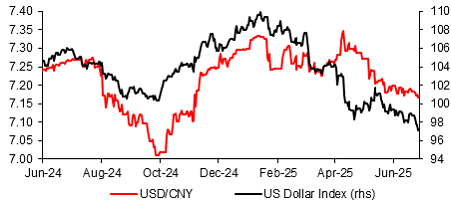 Our call for a mild increase of USD/CNY largely rests on a weaker growth outlook for China’s economy. We expect a growth slowdown from 5.4% in Q1 to 4.2-4.3% in Q4 putting downward pressure on the CNY albeit partly offset by broad-based US dollar weakness. Our FX forecast considers a potential final tariff imposed by US on its imports from China not much different from current 41%. Recently, Howard Lutnick told Bloomberg that China is going to deliver rare earths to US and once China did that, “we’ll take down our countermeasures”. We think that the focus of tariff talks between US and China may be more on exports and investment/technology restrictions, rather than tariff rates. China’s Ministry of Commerce confirmed the news of a finalized trade framework with the US on 27th June, with China to review and approve eligible exports application of controlled-items and US to correspondingly cancel a series of restrictive measures on China. We are aware of the mild strengthening of CNY recently, but it was mainly driven by external factors and with minimal pricing-in of the domestic stress ahead, in our view. The PBoC’s lower USD/CNY fixing recently is likely reflective of the weaker US dollar trend, not shifting of preference for a stronger CNY. A potential PBoC rate cut and weaker exports in Q3 and H2 due to dissipating front-running exports are set to weigh more on the CNY.