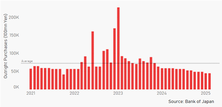 In June the yen weakened versus the US dollar in terms of London closing rates from 144.10 to 144.30. In addition, the yen weakened versus the euro from 163.57 to 169.49. The BoJ at its meeting in June maintained the key policy rate at 0.50%, following the 25bp hike in January, the first 25bp rate hike since before the GFC in 2007. The BoJ is also continuing with the policy of cutting JGB monthly purchases at a pace of JPY 400bn per quarter but announced in June that the pace of reduction will be reduced to JPY 200bn per quarter effective from Q2 2026.