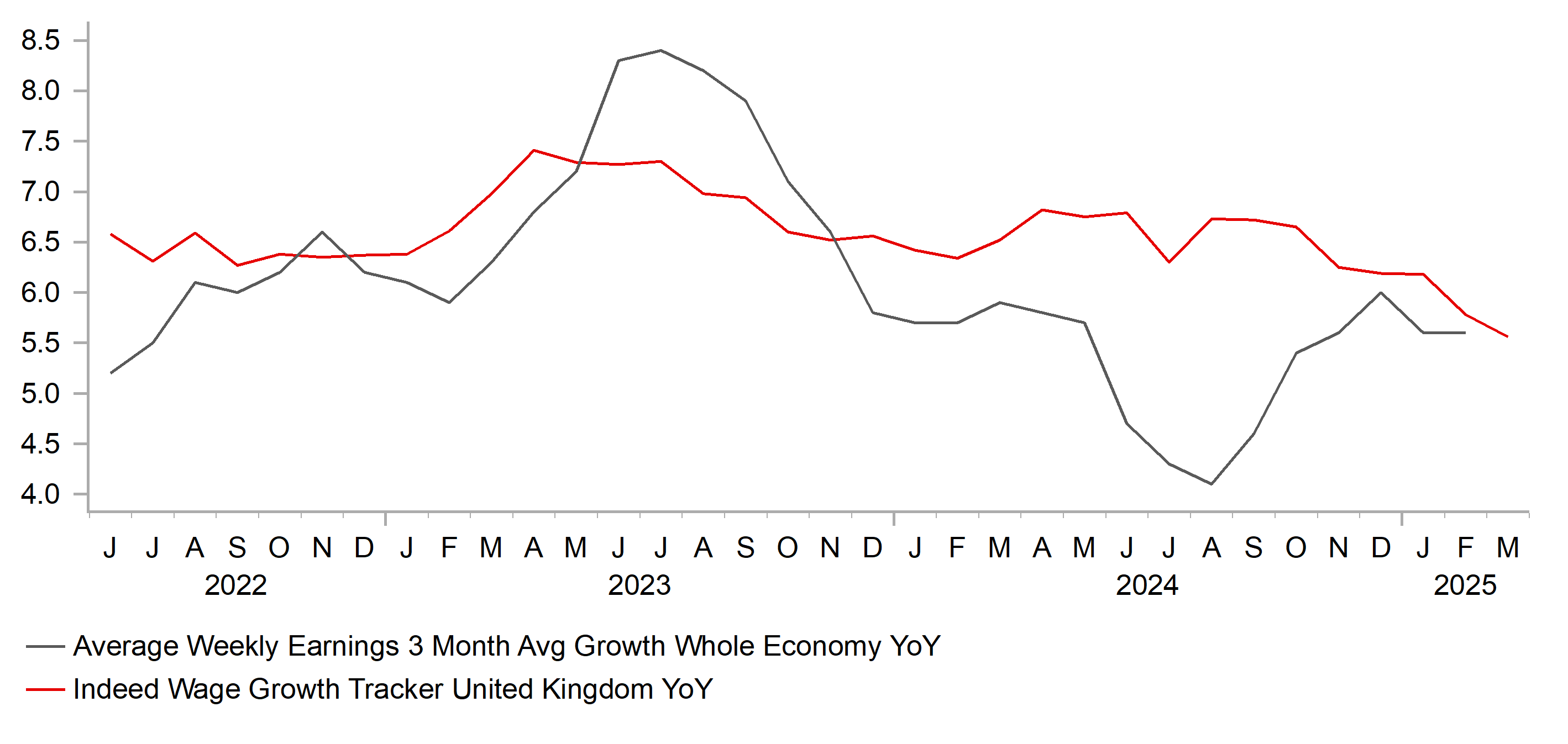The economy continues to show mixed signs with GDP up a very robust 0.5% m/m in February while wage growth remains elevated. But overall the data was consistent with our view that the MPC can continue to cut the key policy rate in a “gradual, careful” manner. The CPI data was weaker than expected while the monthly PAYE employment data showed a 78k drop in jobs after an 8k drop in February. It was the largest drop since the initial phase of covid in 2020. Most BoE comments indicate a leaning more toward trade tariffs being a hit to growth and being deflationary although views have been quite mixed. A May rate cut seems very likely given the weakening of labour demand but moves beyond then will be dependent on supply shortages been modest and inflation relatively contained. We expect the BoE to sustain the pace of a 25bp cut per quarter over the forecast period. If demand for labour was to continue to weaken it could open up a faster pace of cuts towards the end of the year.