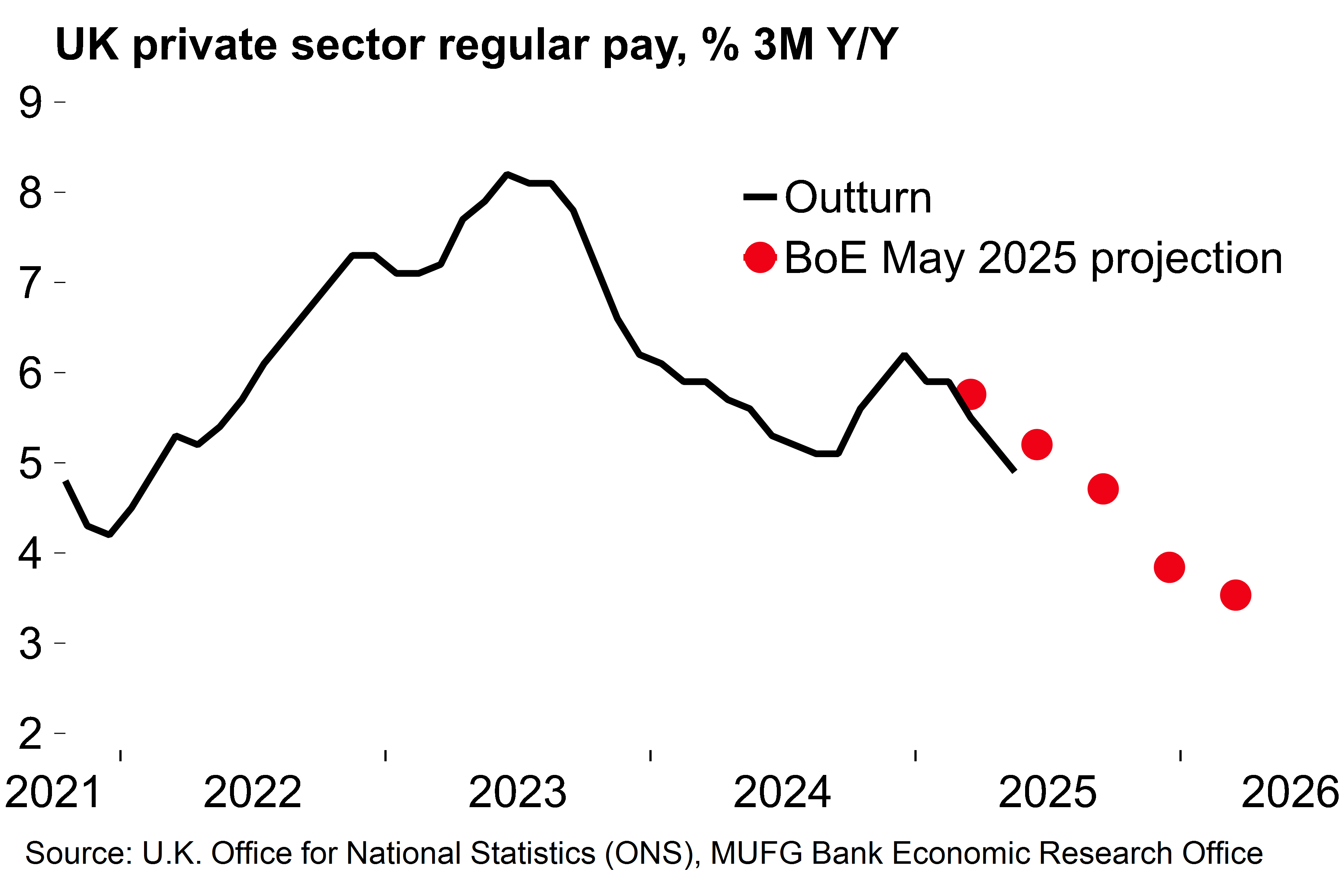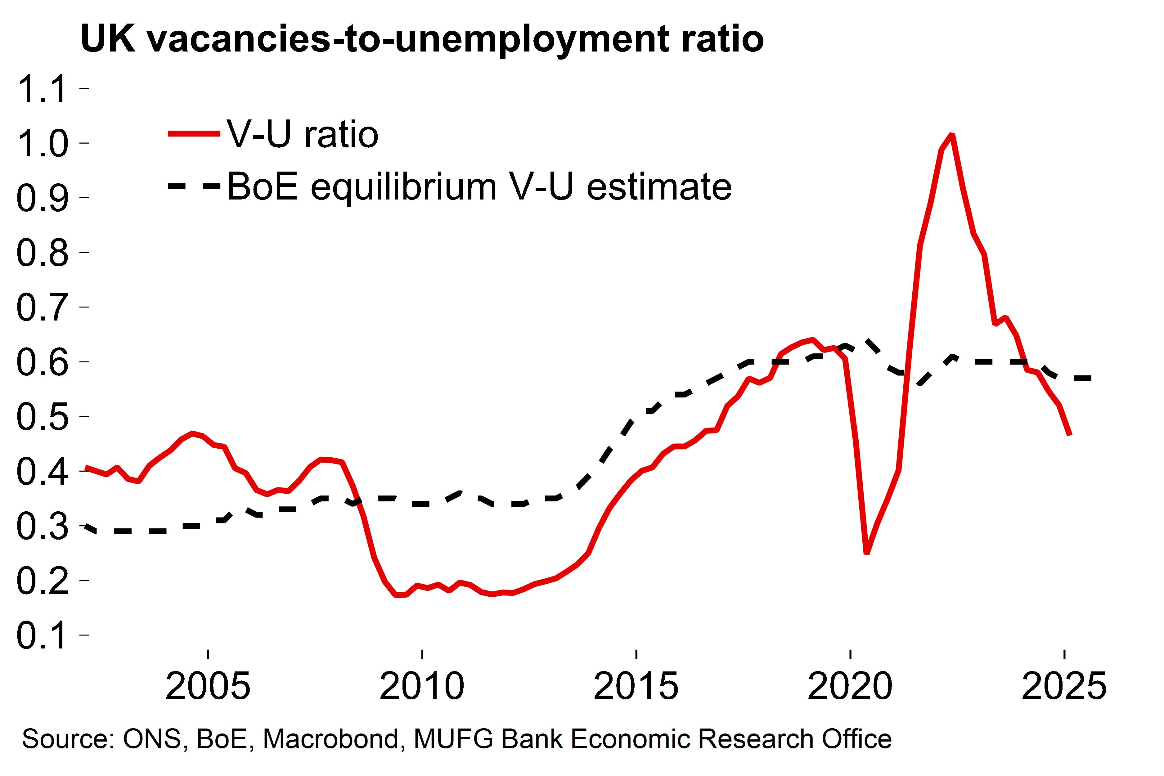 But the general picture of increased UK labour market slack remains in place. The single-month unemployment rate rose to 4.7% in April, from 4.4% at the start of the year. The vacancies-to-unemployment ratio is below the BoE's estimate of equilibrium, and continues to decline. Against that backdrop, wage growth momentum is fading – private sector regular pay growth was 3.7% in May on a three-month annualised basis. Forward-looking survey estimates suggest pay pressures could continue to ease.