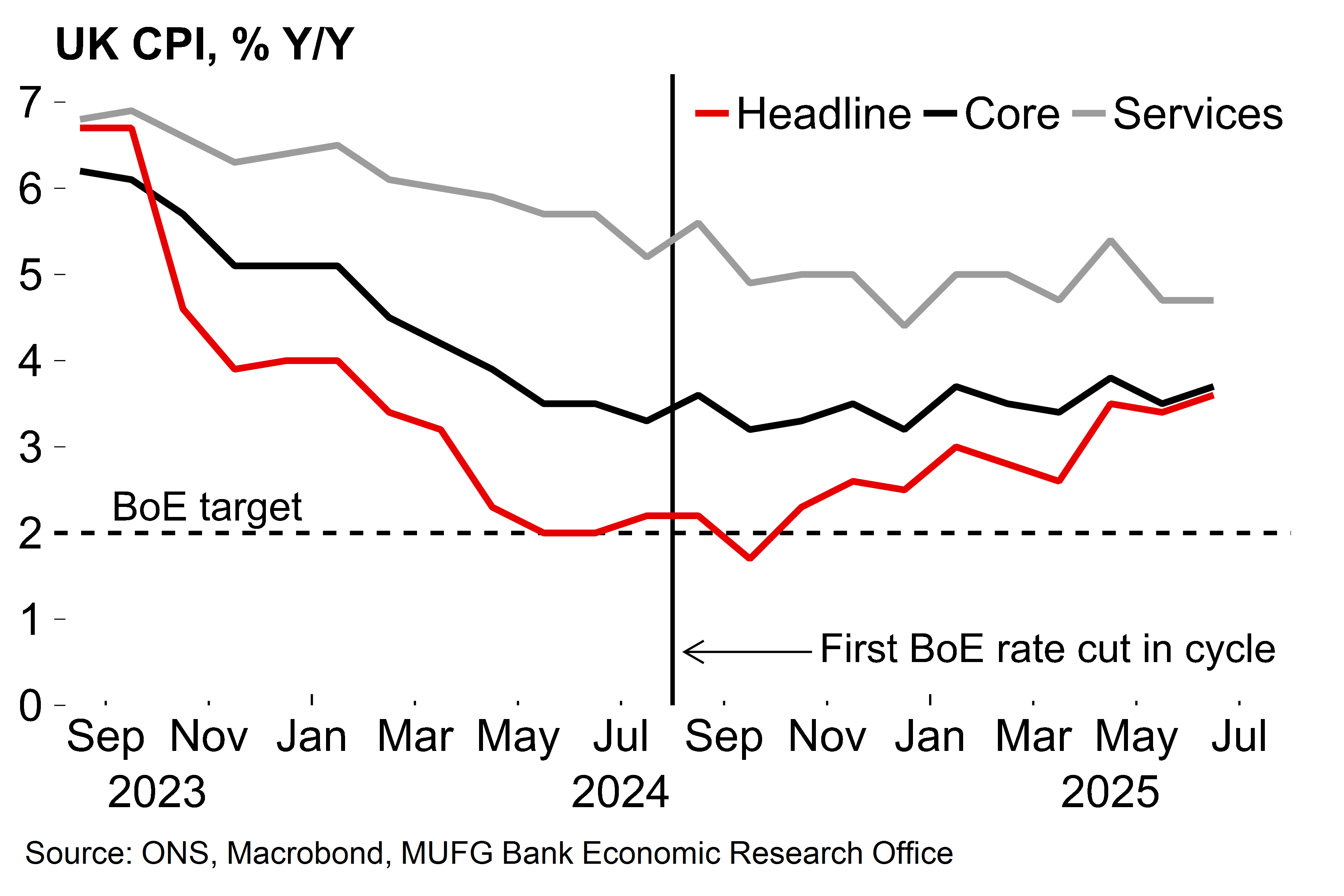 The headline CPI rate increased from 3.4% to 3.6% in June, with the services gauge remaining stuck at 4.7%. Food inflation – which can have a big influence on household inflation expectations – also moved higher, and the latest BRC survey pointed to further upward pressure in July.