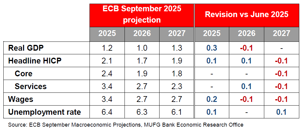 The assessment of the inflation outlook was said to be “broadly unchanged”. The ECB raised its GDP and HICP numbers for 2025. Growth is now seen at 1.2% (in line with our current number) and headline inflation at 2.1%. This update essentially reflects recent data releases rather than any fundamental shift in thinking. Further ahead the profile remains broadly unchanged, although core and headline inflation were revised lower (to 1.8 and 1.9% respectively in 2027), apparently on the back of euro strength.