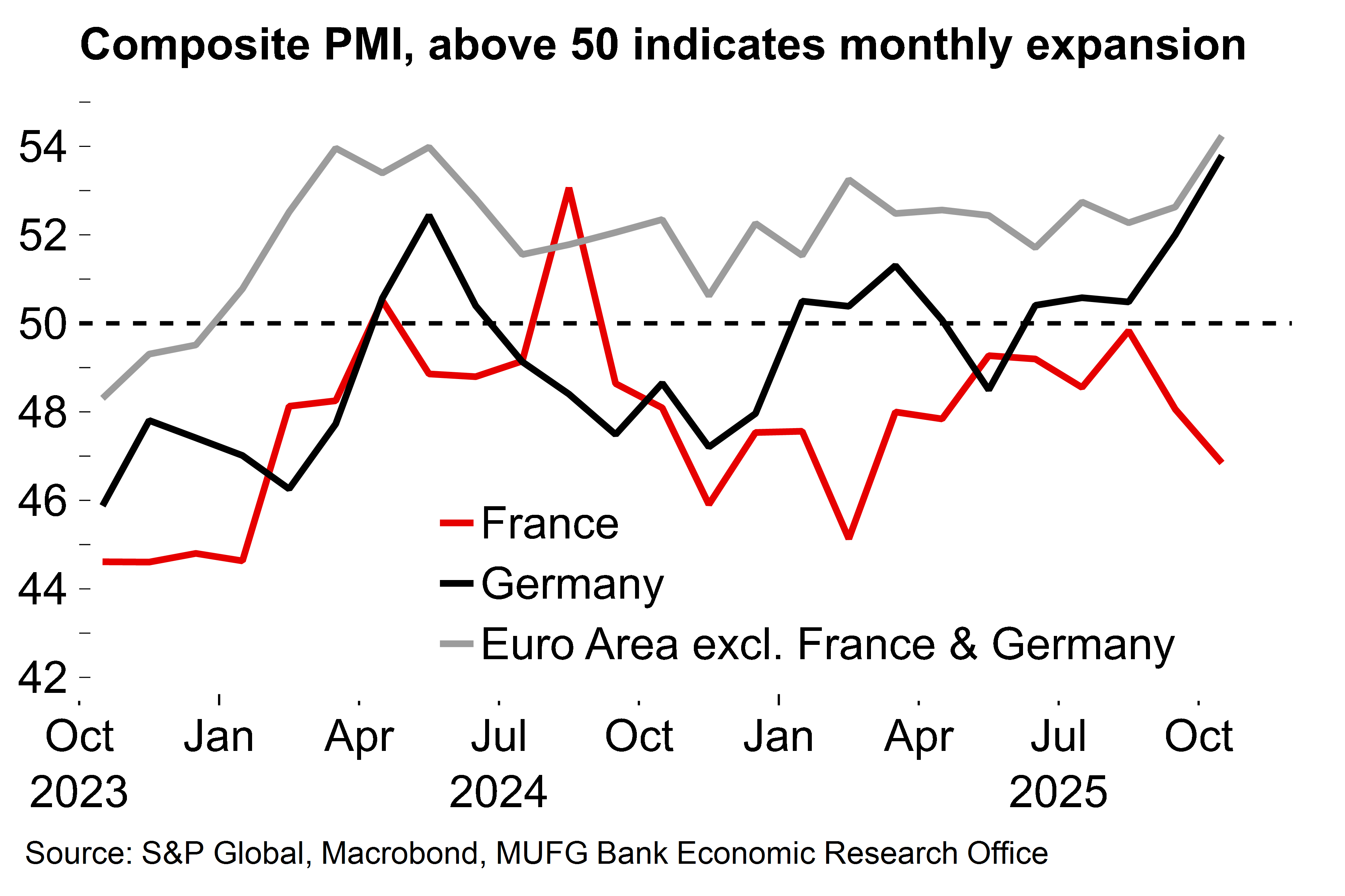 There could also be a focus on fresh data. The first estimate of euro area Q3 GDP will be released on the day of the meeting, as well as German inflation for October (euro area aggregate HICP will be released the following day). We assume that the ECB will have a good steer on those numbers, but doubt they will influence the immediate policy decision. Any weakness in the GDP numbers (we are tracking 0.0% Q/Q, in line with the ECB) would be countered by today’s solid flash PMI numbers for October which suggests downside risks may have faded. The euro area composite output figure reached a 17-month high of 52.2, despite the drag from political turmoil on the French number, and the output prices gauge rose.