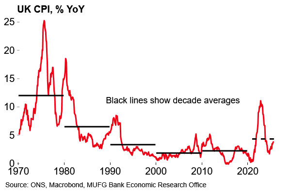 The main development has been the September CPI release which saw the headline rate remaining unchanged at 3.8% rather than peaking at 4.0% as expected. Upward base effects from energy were offset by a downward shift in food inflation (see here). Underlying pressures also continued to gradually ease. The BoE’s measure of services inflation excluding indexed and volatile components eased to 3.9%, the lowest rate since 2022.