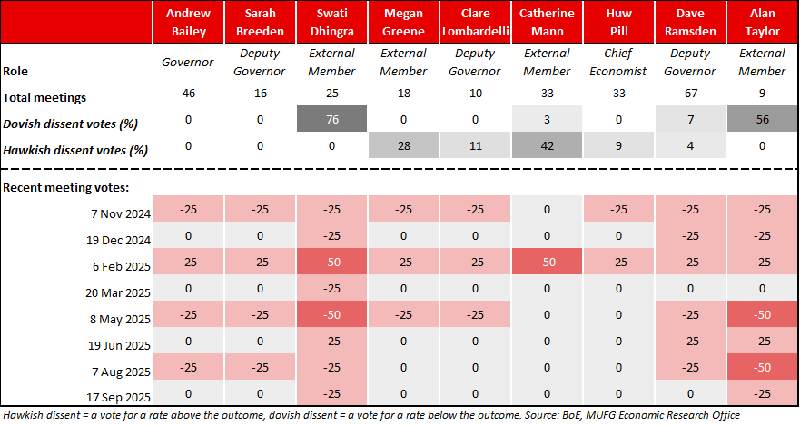 In terms of the vote split, the MPC is plainly divided into established hawkish and dovish camps around a more passive centre. There is a three-strong dovish contingent (Taylor, Dhingra and, with less conviction, Ramsden). All three are likely to vote for a cut at this meeting. We have pencilled in a 6-2-1 vote split with three dissenters for a rate cut with Taylor voting for a larger 50bp move.